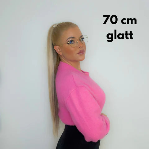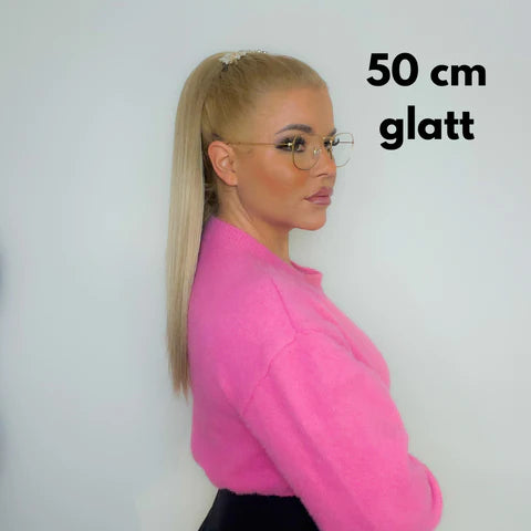 Das Haarteil wird einfach und schnell durch die innovative Montur sicher befestigt. Du bindest dein Eigenhaar zu einem Dutt zusammen, positionierst die vorhandenen Kämmchen oben und unten und ziehst den Kordelzug zu. Du siehst, ein kurzer Handgriff genügt, um mit perfekter Frisur in den Tag zu starten. Zur Sicherheit, bekommst du mit deiner Bestellung eine Video Anleitung, in der wir dir alles nochmal Schritt-für-Schritt zeigen.
